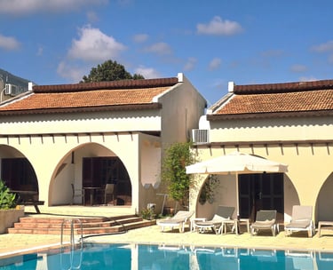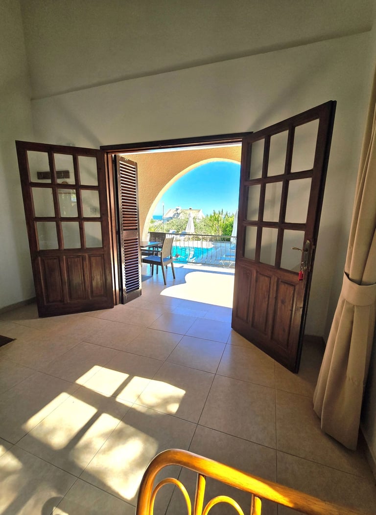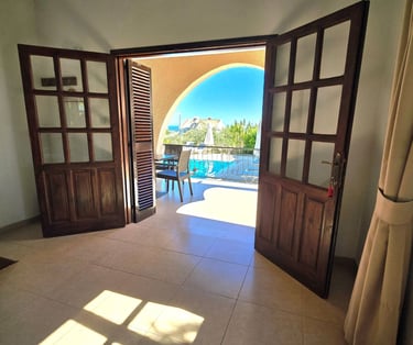 Vor jedem Zimmer liegt Ihre eigene überdachte Terrasse unter einer mediterranen Arkade – mit Tisch, Sitzplätzen und direktem Blick auf den Pool und das Fünf-Finger-Gebirge.