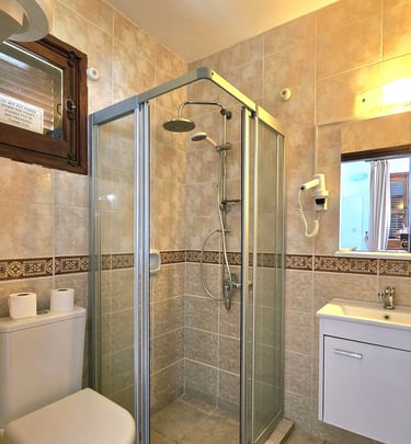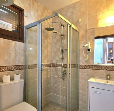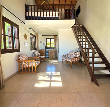 Im Erdgeschoss empfängt Sie ein heller Wohnbereich mit Klimaanlage, Fliesenboden und einer kleinen Teeküche (Kühlschrank, Wasserkocher, Geschirr). Das eigene Bad mit Dusche, Waschbecken und Haartrockner ist ebenfalls unten.