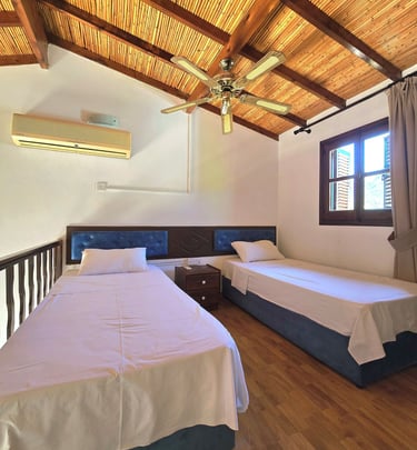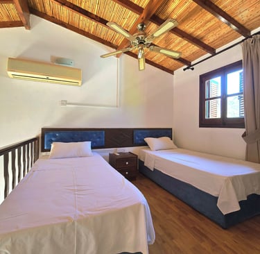 Über eine Holztreppe gelangen Sie in den oberen Schlafbereich unter einer handgefertigten Bambus-Holz-Decke. Hier stehen zwei Einzelbetten, die wir auf Wunsch zu einem Doppelbett zusammenstellen. Klimaanlage und Deckenventilator sind auch oben vorhanden.